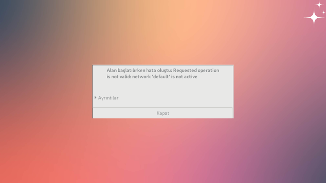 Requested operation is not valid network 'default' is not active Problemi Nasıl Çözülür? Yayınlandı 01-12-2021 İçinde GNU/Linux Bu problemin çözümü için aşağıdaki komutu yazmanız yeterli olacaktır. $ sudo virsh net-start default