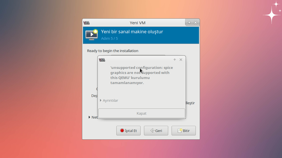 Virt-manager programını açtım. Sanal makineyi oluşturma esnasında hata aldım.